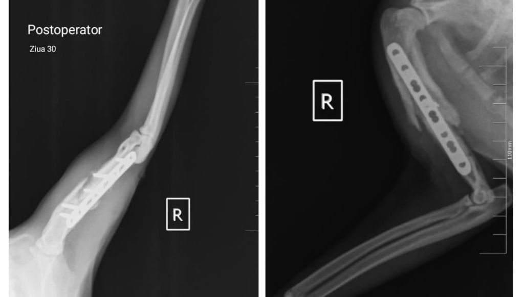 - Corecții osoase complexe: pentru deformări osoase congenitale sau rezultate din traumatisme vechi, se aplică osteotomii personalizate și plăci speciale. De asemenea, artrodeza (fuziunea chirurgicală a unei articulații instabile) poate fi necesară în cazuri grave. Chiar și la animalele exotice de dimensiuni mici, se execută aceste proceduri cu instrumentar miniaturizat.
