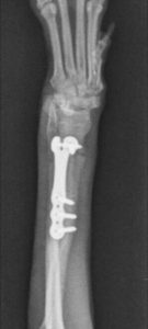 - Osteosinteza: reducerea fracturilor cu implanturi interne (implant centromedular sau plăci și șuruburi) sau externe. De exemplu, fracturile de femur, tibie, humerus, radius/ulna, metacarpiene sau mandibulă sunt stabilizate chirurgical prin montarea plăcilor de osteosinteză și a șuruburilor din titan sau inox. Fracturile fragmentate (cominutive) pot fi menținute în poziție cu fixatoare externe modulare. Toate implanturile folosite în cadrul Spitalului Veterinar Pet Stuff sunt de ultimă generație, optimizate pentru condiția fiecărui pacient.
