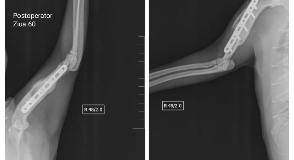 Stabilizarea a fost realizată cu implanturi ortopedice dedicate, iar imaginile postoperatorii confirmă obținerea unei alinieri corecte și a unei fixări stabile. Evoluția pacientului a fost urmărită radiologic de-a lungul procesului de vindecare, observându-se formarea progresivă a calusului și consolidarea completă a osului.