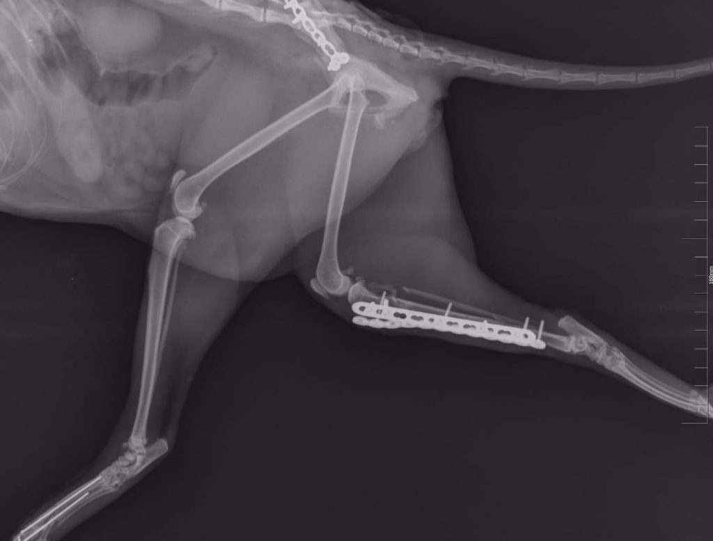 În acest caz, examenul radiologic a evidențiat o fractură de paletă iliacă și o desmorexie sacro-iliacă. Ambele leziuni au necesitat intervenție chirurgicală, iar stabilizarea a fost realizată cu plăcuță și șuruburi special adaptate anatomiei feline.